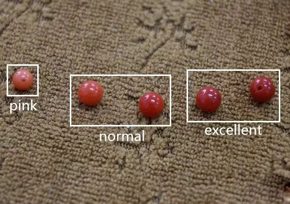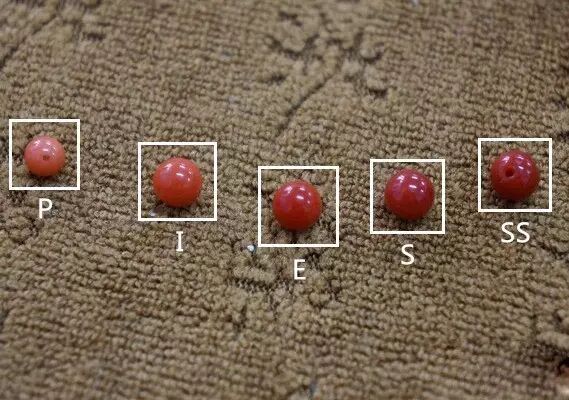 从左到右,依次是P、I、E、S、SS等级,而按意大利的等级来分,则左边第一颗为pink,左起第2和第3颗为normal,右边2颗为excellent等级。所以,从外国批发回来的沙丁珊瑚,一般还要经过第2轮分拣,区分出更细的颜色级别。